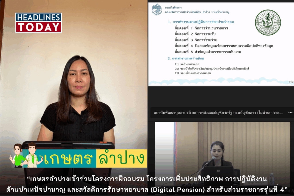 วันที่ 20 – 21 มกราคม 2569 นายอภิรักษ์ หลักชัยกุล เกษตรจังหวัดลำปาง มอบหมายให้ นางสาวกันยาวีร์  สิทธิวีระกูล  เจ้าพนักงานธุรการชำนาญงาน เข้าร่วมการฝึกอบรมโครงการเพิ่มประสิทธิภาพ การปฏิบัติงานด้านบำเหน็จบำนาญ และสวัสดิการรักษาพยาบาล (Digital Pension) สำหรับส่วนราชการรุ่นที่ 4  ในรูปแบบ Hybrid (อบรม Onsite ณ ห้องประชุม 1 ชั้น 7กรมบัญชีกลาง และอบรม Online ผ่านระบบโปรแกรม Microsoft Teams)