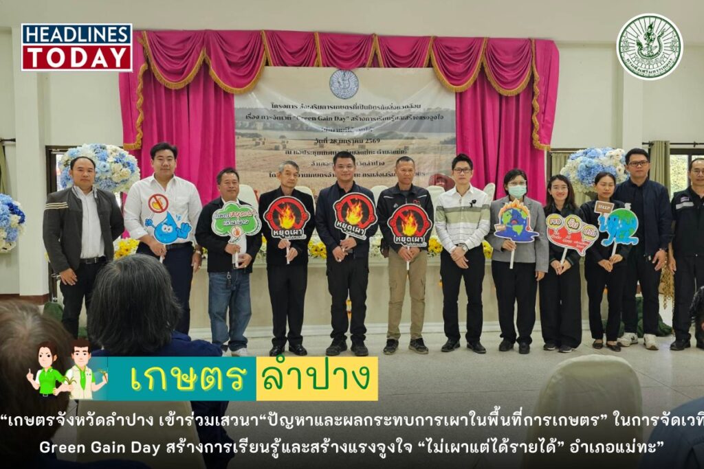 วันที่ 28 มกราคม 2569 เวลา 10.00 น. นายอภิรักษ์ หลักชัยกุล เกษตรจังหวัดลำปาง พร้อมด้วยนางกีรติกร พรรณกมลกุล หัวหน้ากลุ่มอารักขาพืช และนายสงกรานต์ ดวงอ้าย นักวิชาการส่งเสริมการเกษตรชำนาญการ กลุ่มอารักขาพืช สำนักงานเกษตรจังหวัดลำปาง เข้าร่วมกิจกรรมการจัดเวที Green Gain Day สร้างการเรียนรู้และสร้างแรงจูงใจ “ไม่เผาแต่ได้รายได้” ภายใต้โครงการส่งเสริมการเกษตรที่เป็นมิตรกับสิ่งแวดล้อม ปี 2569 โดยมีวัตถุประสงค์เพื่อเสริมสร้างการมีส่วนร่วมของเกษตรกรและชุมชนในการแก้ไขปัญหาการเผาในพื้นที่การเกษตร โดยมีนายบัณฑิต เจริญ ปลัดอำเภอหัวหน้ากลุ่มงานบริหารงานปกครอง ผู้แทนนายอำเภอแม่ทะ ร่วมพบปะเกษตรกรผู้เข้าร่วมการจัดเวที Green Gain Day จำนวน 50 ราย ประกอบด้วยเกษตรกรจากอำเภอแม่ทะ, อำเภอแม่เมาะ และอำเภองาว ณ หอประชุมเทศบาลตำบลแม่ทะ ตำบลแม่ทะ อำเภอแม่ทะ จังหวัดลำปาง ในการจัดเวทีครั้งนี้ ประกอบด้วย การเสวนา เรื่อง “ปัญหาและผลกระทบการเผาในพื้นที่การเกษตร” โดย เกษตรจังหวัดลำปาง ได้เข้าร่วมเสวนากับเจ้าหน้าที่จากสถานีพัฒนาที่ดินจังหวัดลำปาง, เจ้าหน้าที่จากสำนักงานปฏิรูปที่ดินเพื่อการเกษตรจังหวัดลำปาง, เจ้าหน้าที่จากสำนักงานสาธารณสุขอำเภอแม่ทะ, รองนายกเทศบาลตำบลแม่ทะ และตัวแทนจาก บริษัท นอร์ทเทอร์น สยามซีดแลค จำกัด นอกจากนี้ ยังมีกิจกรรมการแลกเปลี่ยนเรียนรู้ของผู้เข้าร่วมการจัดเวที Green Gain Day เพื่อป้องกันและแก้ไขปัญหาฝุ่นละอองขนาดเล็กไม่เกิน 2.5 ไมครอน (PM 2.5) ภาคเกษตร พร้อมกับการสาธิตและฝึกปฏิบัติการเพิ่มมูลค่าเศษวัสดุทางการเกษตร โดยใชเทคโนโลยีทดแทนการเผาตามหลัก 3R models โดย เกษตรกรต้นแบบ (การใช้เตาเผาถ่านไบโอชาร์และการเพาะเห็ดฟางในตระกร้า)