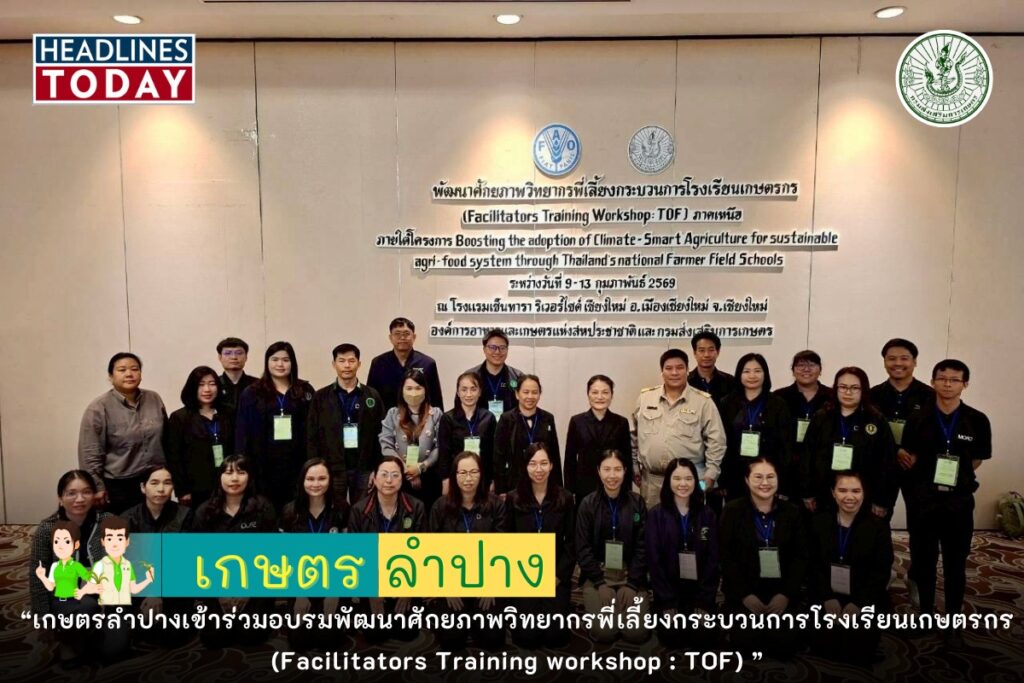 วันที่ 9-13 กุมภาพันธ์ 2569 นายอภิรักษ์ หลักชัยกุล เกษตรจังหวัดลำปาง มอบหมายให้นางสาววัชราภรณ์ มะโนคำ นักวิชาการส่งเสริมการเกษตรชำนาญการ กลุ่มอารักขาพืช สำนักงานเกษตรจังหวัดลำปาง และ นายอนุชิต ศรีฉัตรใจ นักวิชาการส่งเสริมการเกษตรชำนาญการ สำนักงานเกษตรอำเภอแจ้ห่ม เข้าร่วมอบรมพัฒนาศักยภาพวิทยากรพี่เลี้ยงกระบวนการโรงเรียนเกษตรกร (Facilitators Training workshop : TOF) ภายใต้โครงการ Boosting the adoption of ClimateSmart Agriculture for sustainable agri-food system through Thailand’s national Farmer Field Schools ภายใต้กรอบความร่วมมือกับ FAO