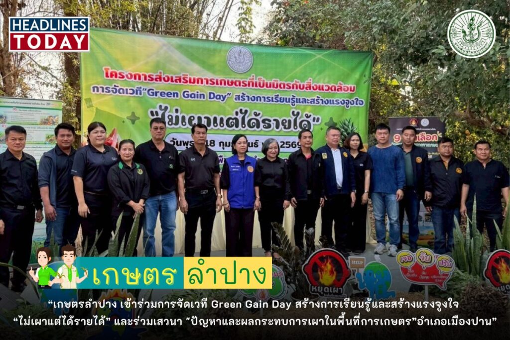 วันที่ 18 กุมภาพันธ์ 2569 เวลา 09.00 น. นายอภิรักษ์ หลักชัยกุล เกษตรจังหวัดลำปาง มอบหมายให้นางกีรติกร พรรณกมลกุล หัวหน้ากลุ่มอารักขาพืช และนายสงกรานต์ ดวงอ้าย นักวิชาการส่งเสริมการเกษตรชำนาญการ กลุ่มอารักขาพืช สำนักงานเกษตรจังหวัดลำปาง เข้าร่วมกิจกรรมการจัดเวที Green Gain Day สร้างการเรียนรู้และสร้างแรงจูงใจ “ไม่เผาแต่ได้รายได้” ภายใต้โครงการส่งเสริมการเกษตรที่เป็นมิตรกับสิ่งแวดล้อม ปี 2569 โดยมีวัตถุประสงค์เพื่อเสริมสร้างการมีส่วนร่วมของเกษตรกรและชุมชนในการแก้ไขปัญหาการเผาในพื้นที่การเกษตร โดยมีนางจินตนา มุงเมือง ปลัดอำเภอหัวหน้ากลุ่มงานบริหารงานปกครอง ผู้แทนนายอำเภอเมืองปาน เป็นประธานเปิดงาน นายชำนาญ เมืองลอง เกษตรอำเภอเมืองปาน กล่าวรายงาน หัวหน้าส่วนราชการ เจ้าหน้าที่และเกษตรกรอำเภอเมืองปาน อำเภอแจ้ห่ม และอำเภอวังเหนือ เข้าร่วมงาน จำนวน 50 ราย กิจกรรมในการจัดเวทีครั้งนี้ ประกอบด้วย การเสวนา เรื่อง “ปัญหาและผลกระทบการเผาในพื้นที่การเกษตร” โดยนายสงกรานต์ ดวงอ้าย นักวิชาการส่งเสริมการเกษตรชำนาญการ กลุ่มอารักขาพืช สำนักงานเกษตรจังหวัดลำปาง ได้เข้าร่วมเสวนากับเจ้าหน้าที่จากสถานีพัฒนาที่ดินจังหวัดลำปาง, ผู้อำนวยการโรงพยาบาลส่งเสริมสุขภาพตำบลบ้านทุ่งข่วง ตำบลทุ่งกว๋าว และ อาจารย์คณะพืชไร่ มหาวิทยาลัยเกษตรศาสตร์ นอกจากนี้ ยังมีกิจกรรมการแลกเปลี่ยนเรียนรู้ของผู้เข้าร่วมการจัดเวที Green Gain Day เพื่อป้องกันและแก้ไขปัญหาฝุ่นละอองขนาดเล็กไม่เกิน 2.5 ไมครอน (PM 2.5) ภาคเกษตร พร้อมการสาธิตและฝึกปฏิบัติการเพิ่มมูลค่าเศษวัสดุทางการเกษตร โดยใชเทคโนโลยีทดแทนการเผาตามหลัก 3R models จำนวน 4 ฐานเรียนรู้ ประกอบด้วย