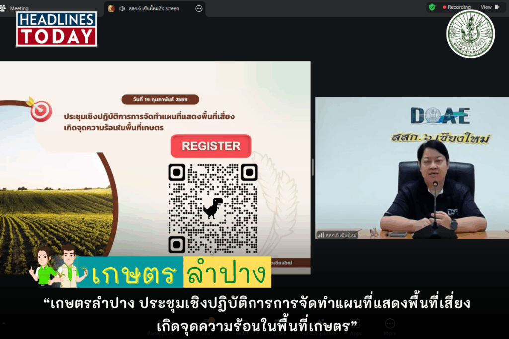 วันที่ 19 กุมภาพันธ์ 2569 นายอภิรักษ์ หลักชัยกุล เกษตรจังหวัดลำปาง มอบหมายให้เจ้าหน้าที่ผู้รับผิดชอบงานโครงการส่งเสริมการเกษตรที่เป็นมิตรกับสิ่งแวดล้อม ระดับจังหวัดและระดับอำเภอ เข้าร่วมประชุมเชิงปฏิบัติการการจัดทำแผนที่แสดงพื้นที่เสี่ยงเกิดจุดความร้อนในพื้นที่เกษตร เพื่อเสริมสร้างความรู้ ความเข้าใจ และเพิ่มทักษะในการใช้ข้อมูลเชิงพื้นที่ สำหรับการเฝ้าระวังและบริหารจัดการความเสี่ยงจากจุดความร้อนในพื้นที่เกษตร ซึ่งจัดการประชุมโดยสำนักงานส่งเสริมและพัฒนาการเกษตรที่ 6 จังหวัดเชียงใหม่ ผ่านระบบการประชุม Application Zoom Meeting โดยมี นางสาววรวรรณ อังกสิทธิ์ ผู้อำนวยการกลุ่มพัฒนาบุคลากร เป็นประธานเปิดการประชุม จากห้องประชุมชั้น 2 สำนักงานส่งเสริมและพัฒนาการเกษตรที่ 6 จังหวัดเชียงใหม่