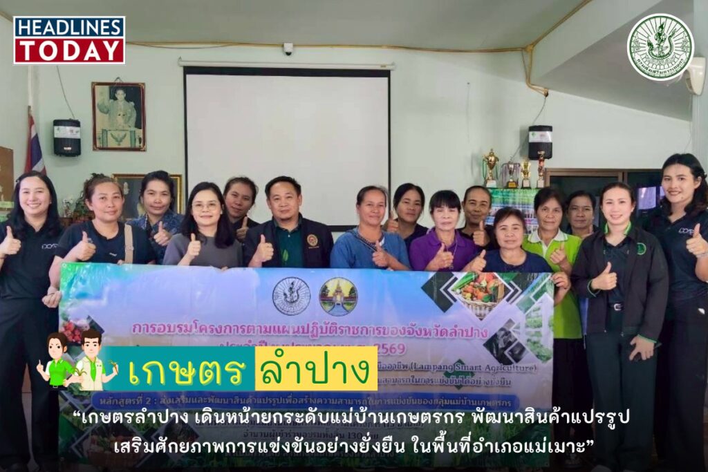 วันที่ 26 กุมภาพันธ์ 2569 นายอภิรักษ์ หลักชัยกุล เกษตรจังหวัดลำปาง มอบหมายให้ ว่าที่ร้อยตรีหญิง วรณัน จารุทะวัย นักวิชาการส่งเสริมการเกษตรชำนาญการ และ น.ส.ฉัตรภรณ์ แก้วสอน นักวิชาการส่งเสริมการเกษตรปฏิบัติการ กลุ่มส่งเสริมและพัฒนาเกษตรกร สำนักงานเกษตรจังหวัดลำปาง ร่วมกับสำนักงานเกษตรอำเภอแม่เมาะ จัดอบรมหลักสูตรที่ 2 “ส่งเสริมและพัฒนาสินค้าแปรรูปเพื่อสร้างความสามารถในการแข่งขันของกลุ่มแม่บ้านเกษตรกร” ภายใต้กิจกรรมยกระดับกลุ่มแม่บ้านเกษตรกรให้มีความเข้มแข็ง และเพิ่มขีดความสามารถในการแข่งขันอย่างยั่งยืน โครงการยกระดับขีดความสามารถเกษตรกรและผู้ประกอบการธุรกิจเกษตรให้เป็นมืออาชีพ (Lampang Smart Agriculture) ตามแผนปฏิบัติราชการของจังหวัดลำปาง ประจำปีงบประมาณ พ.ศ. 2569 ณ กลุ่มแม่บ้านเกษตรกรบ้านปงหลวงหมู่ที่ 1 ตำบลเสริมขวา อำเภอแม่เมาะ จังหวัดลำปาง