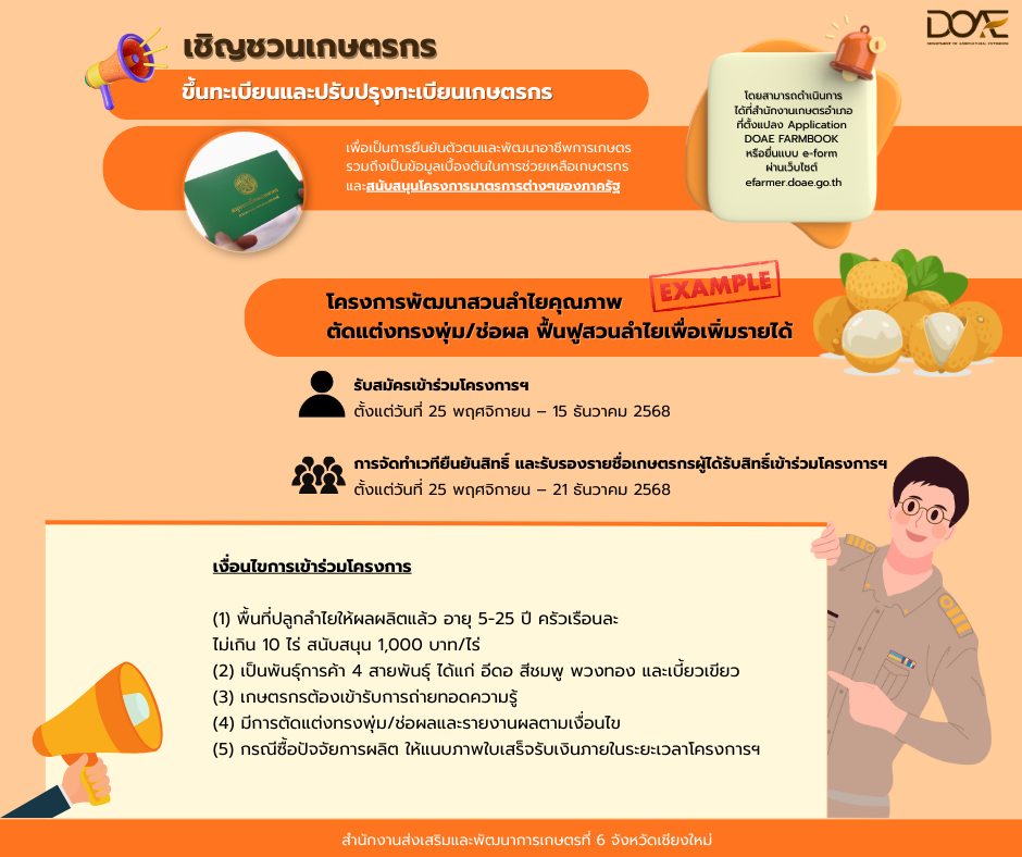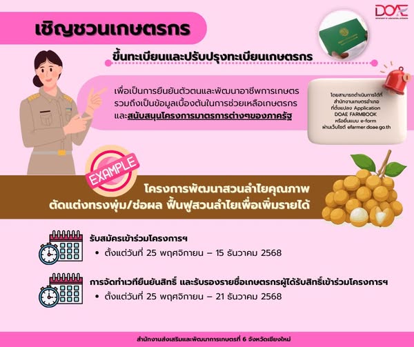Info เพื่อการประชาสัมพันธ์เกษตรกรโปรดตรวจสอบและปรับปรุงทะเบียนของท่านให้เป็นปัจจุบัน เพื่อให้ข้อมูลถูกต้องและสามารถเข้าถึงโครงการสนับสนุนต่าง ๆ ได้อย่างต่อเนื่องค่ะ admin_doae / 10 ธันวาคม 2025